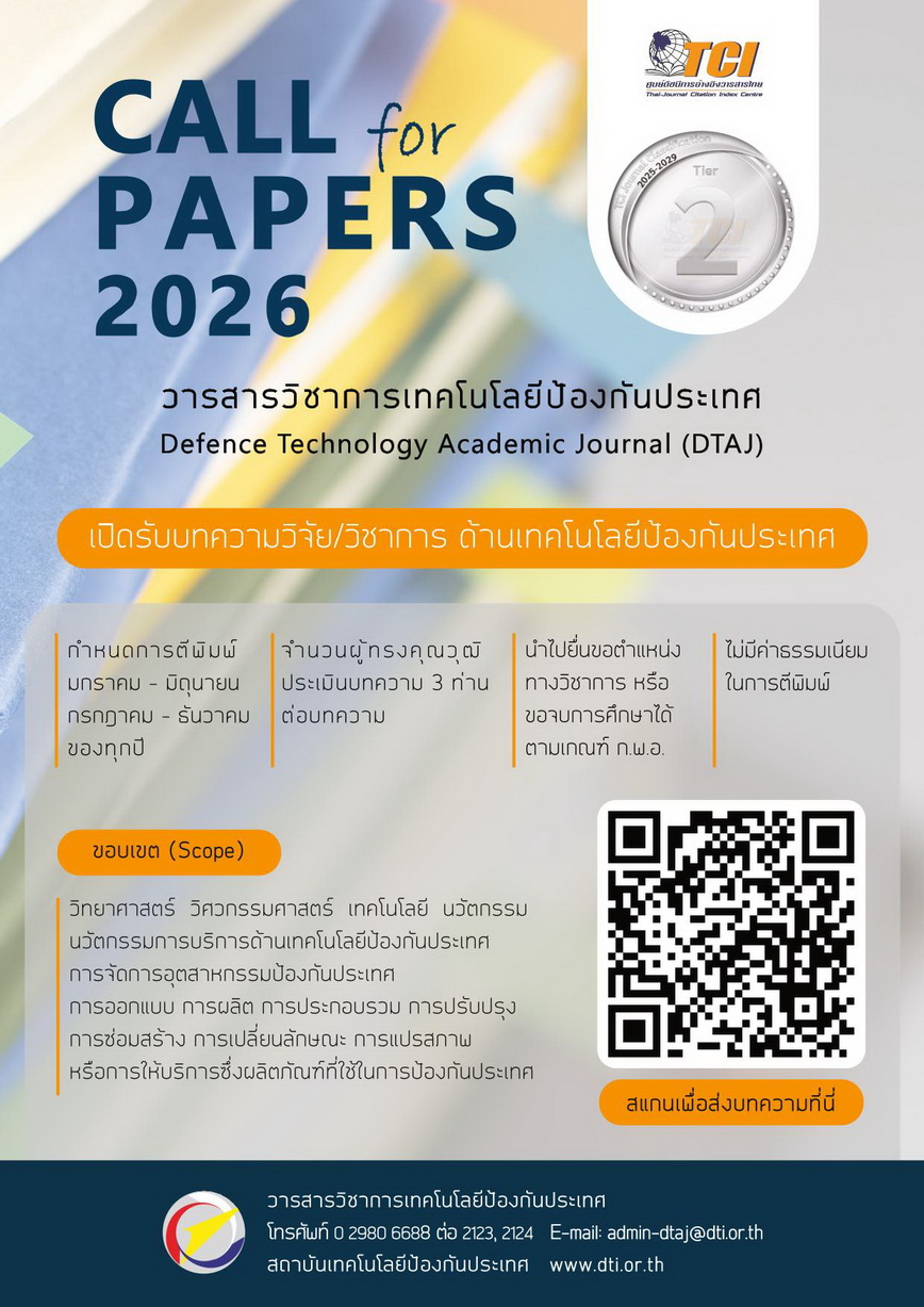 สำนักงานปลัดกระทรวงการอุดมศึกษา วิทยาศาสตร์ วิจัยและนวัตกรรม ขอประชาสัมพันธ์เชิญชวนหน่วยงานในสังกัดกระทรวงการอุดมศึกษา วิทยาศาสตร์ วิจัยและนวัตกรรม ทั้งภาครัฐและเอกชน ร่วมส่งบทความวิจัยและผลงานทางวิชาการเพื่อตีพิมพ์ในวารสารวิชาการด้านเทคโนโลยีป้องกันประเทศ (Defence Technology Academic Journal: DTAJ)