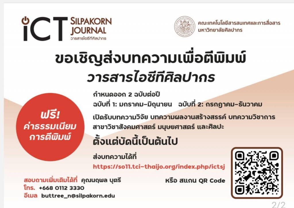 ขอเชิญชวน คณาจารย์ นักวิจัย บุคลากรบัณฑิตศึกษา รวมถึงผู้ที่สนใจ ส่งบทความวิจัย บทความผลงานสร้างสรรค์ และบทความวิชาการ ในสาขาวิชาสังคมศาสตร์ มนุษยศาสตร์ ศิลปะ หรือสาขาวิชาอื่น ๆ ที่เกี่ยวข้อง ตีพิมพ์ใน “วารสารไอซีทีศิลปากร” โดยคณะเทคโนโลยีสารสนเทศและการสื่อสาร มหาวิทยาลัยศิลปากร ทั้งนึ้วารสารมีกำหนดออกวารสาร ปีละ 2 ฉบับ ฉบับที่ 1 มกราคม – มิถุนายน และฉบับที่ 2 กรกฎาคม – ธันวาคม ทั้งนี้สามารถส่งบทความ และดูรายละเอียดเพิ่มเติมได้ที่เว็บไซต์ https://so11.tci-thaijo.org/index.php/ictsj หรือ QR CODE
