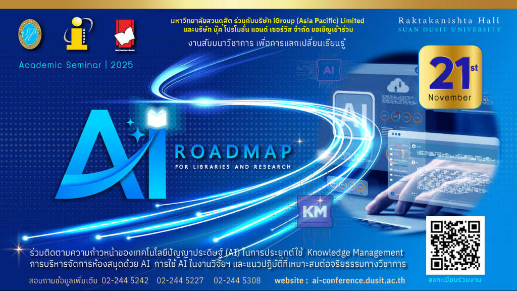ด้วย มหาวิทยาลัยสวนดุสิต ร่วมกับบริษัท iGroup (Asia Pacific) Limited และบริษัท บุ๊ค โปรโมชั่น แอนด์ เซอร์วิส จำกัด ได้ร่วมกันจัดงานสัมมนาวิชาการ ภายใต้หัวข้อ Al Roadmap for Libraries and Research มีกำหนดจัดขึ้นในวันที่ 21 พฤศจิกายน 2568 ณ ห้องประชุมอาคารรักตะกนิษฐ ชั้น 1 – 2 และอาคาร One World Library ชั้น 1 มหาวิทยาลัยสวนดุสิต