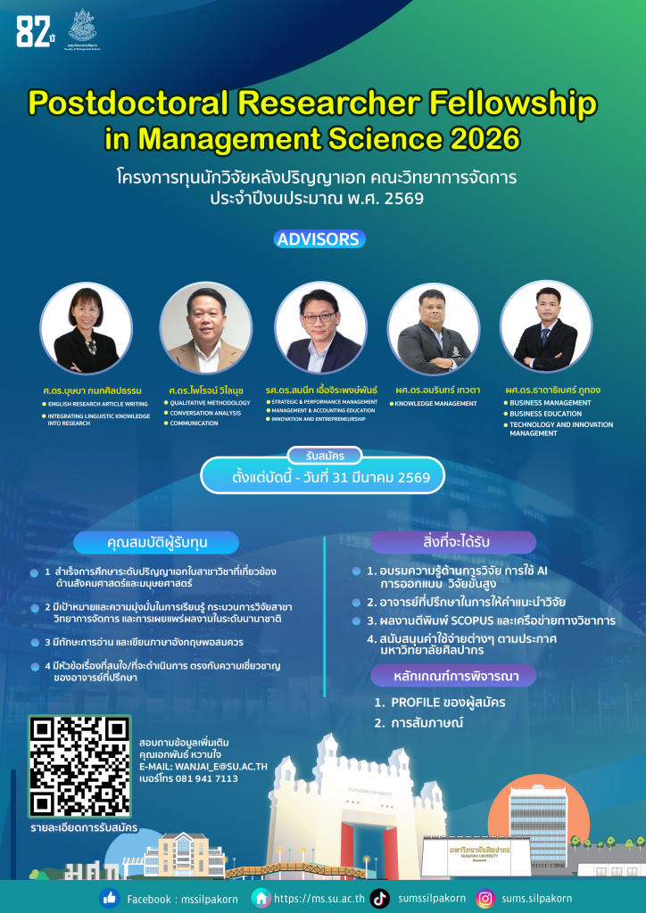 คณะวิทยาการจัดการ มหาวิทยาลัยศิลปากร ประกาศเชิญชวนผู้สนใจเข้าร่วมโครงการทุนนักวิจัยหลังปริญญาเอก ประจำปีงบประมาณ พ.ศ. 2569 เพื่อสนับสนุนการผลิตผลงานวิจัยคุณภาพสูง และการเผยแพร่ในวารสารระดับนานาชาติที่อยู่ในฐานข้อมูล Scopus