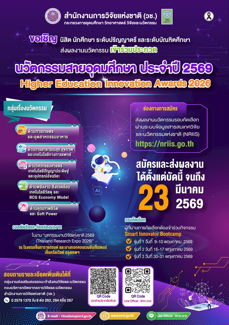 สำนักงานการวิจัยแห่งชาติ (วช.) ขอเชิญชวนสถาบันการศึกษา ส่งนิสิต นักศึกษา ทั้งในระดับปริญญาตรีและระดับบัณฑิตศึกษาที่อยู่ระหว่างการศึกษา เข้าร่วมการประกวดผลงานนวัตกรรมสายอุดมศึกษา ประจำปี 2569 เพื่อกระตุ้นและสร้างแรงจูงใจในการพัฒนานิสิต นักศึกษาให้เป็นนักวิจัยและนวัตกรที่มีคุณภาพ โดยการประกวดนี้จะจัดขึ้นในระหว่างงาน “มหกรรมงานวิจัยแห่งชาติ 2569 (Thailand Research Expo 2026)” ณ โรงแรมเซ็นทาราแกรนด์และบางกอกคอนเวนชันเซ็นเตอร์ เซ็นทรัลเวิลด์ กรุงเทพฯ