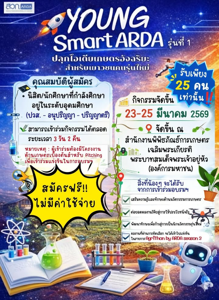ARDA เปิดรับสมัคร “Young Smart ARDA รุ่นที่ 1” ค่ายสุดล้ำที่จะพาคุณก้าวจากไอเดีย → สู่นวัตกรรมเกษตรอัจฉริยะตัวจริง